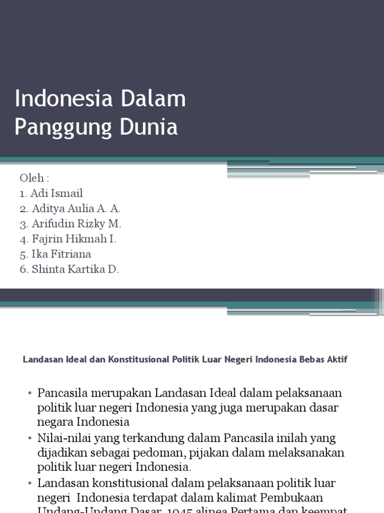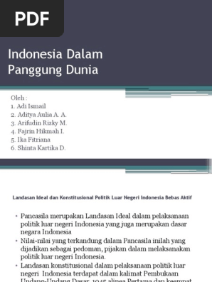 Makalah tentang indonesia dalam panggung dunia. 18 April-24 April 1955 di Gedung Merdeka Bandung. Presiden Soekarno dalam era ini berusaha sekuat tenaga untuk mempromosikan Indonesia ke dunia internasional melalui slogan revolusi nasionalnya yakni Nasakom nasionalis agama dan komunis dimana elemen-elemen ini diharapkan dapat beraliansi untuk mengalahkan Nekolim Neo Kolonialisme dan Imperialisme. Landasan Ideal dalam pelaksanaan politik luar negeri Indonesia adalah Pancasila yang merupakan dasar negara Indonesia.