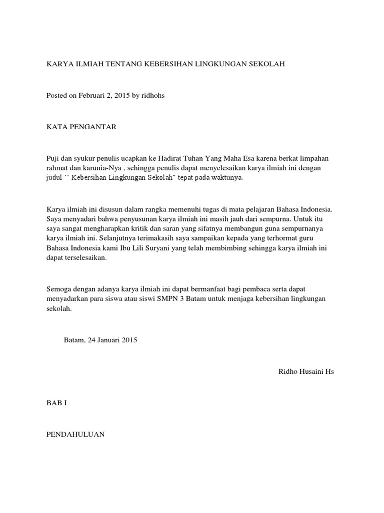 Contoh kata pengantar karya ilmiah tentang kebersihan lingkungan. Wish You Were HereDan artinya -- Avril lavigne. Contoh Proposal Karya Ilmiah Kebersihan Lingkungan Terbaru Pada dasarnya karya ilmiah tersebut membahas mengenai kebersihan yang terdapat di lingkungan sekitar kita. Diharapkan Karya Ilmiah ini dapat memberikan informasi kepada kita semua tentang kebersihan lingkungan di sekitar kita.