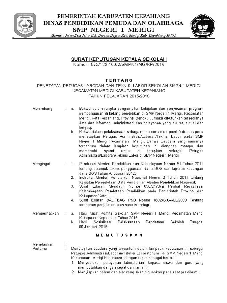 5 Membuat laporan secara periodic. Sehat jasmani mental dan rohani serta mampu menjalankan tugas sebagai Kepala Laboratorium. Contoh Surat Keputusan Kepala Sekolah Surat Keputusan atau SK adalah sebuah surat pernyataan yang di keluarkan oleh lembaga yang berisikan suatu kebijakan atau ketentuan yang bersangkutan dengan lembaga tertentu misalkan Sekolah Perusahaan DLL.