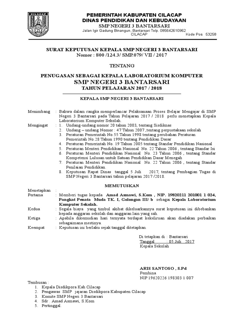KEPALA SMP NEGERI 3 BANTARSARI. Rsudyahoocoid keputusan direktur rsud kraton kabupaten pekalongan nomor 445 001 akr lab tahun 2011 tentang penempatan sebagai kepala instalasi laboratorium rsud kraton kabupaten pekalongan direktur rsud kraton. Spj triwulan 1 tahap 2 dikdas dan paud.