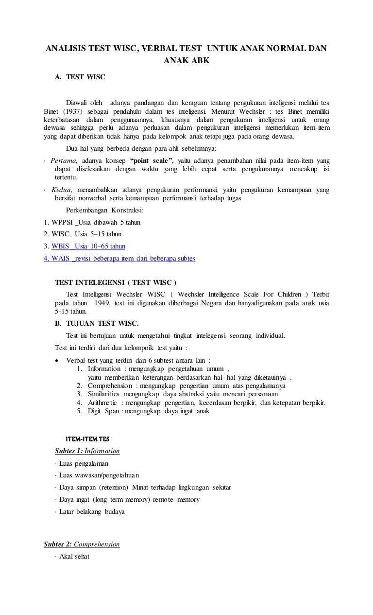 Untuk bisa menyajikan tes WAIS ini dengan baik tester harus memahami dan melakukan petunjuk-petunjuk dalam manual tes ini dengan. Contoh Soal Tes Bumn. SUBTES-SUBTES PERSOALAN DALAM WISC Materi tes WISC terbagi menjadi 11 subtes persoalan.