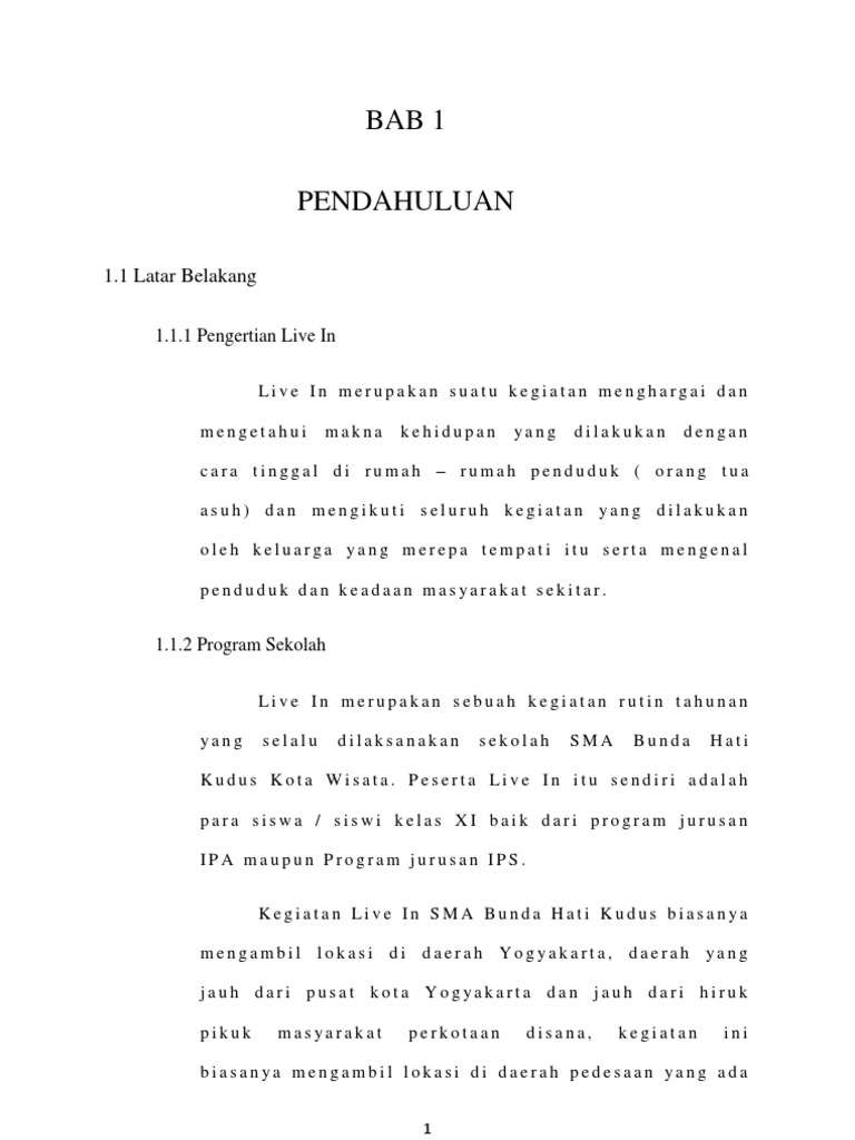 Bab i pendahuluan 11. Semangat ini adalah menjadi sesama bagi yang lain Live in merupakan salah satu sarana pembentukan kepribadian yang kami tawarkan bagi para siswa agar para siswa memiliki kepribadian dewasa yang mau terlibat kepada masalah-masalah kehidupan bersama. Unduh sebagai DOCX PDF TXT atau baca online dari Scribd.