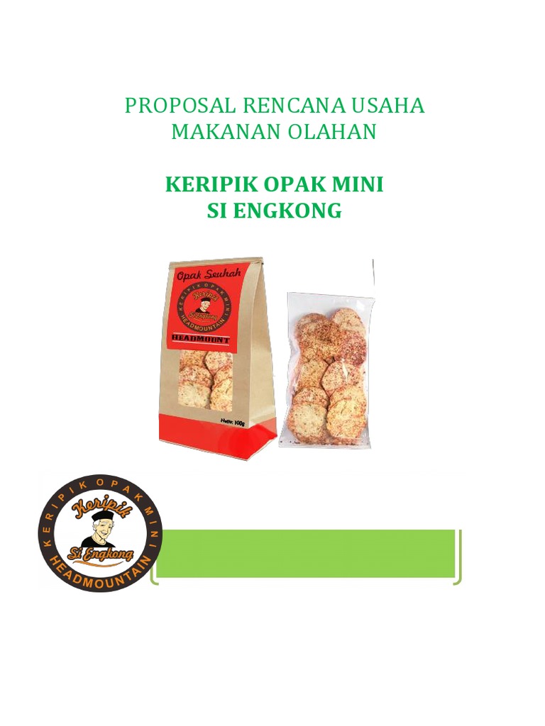 Contoh Proposal Kewirausahaan Kripik Singkong. Proses pembuatan opak singkong berbasis 5 kg singkong per hari dengan menghasilkan 100 bungkus opak singkong. Padahal masih banyak jenis cemilan lain yang sehat bagi tubuh kita seperti gethuk kripik tela tape tela dan tela goreng yang berbahan baku dari singkong cemilan ini tentu lebih menyehatkan dibanding dengan cemilan yang mengandung zat-zat berbahayaBanyaknya usaha kecil dan menengah yang memproduksi makanan ringancemilan berbahanbaku singkong seperti tape singkong gethuk telatela dan kripik singkong telah menginspirasi kami untuk memanfaatkan singkong.