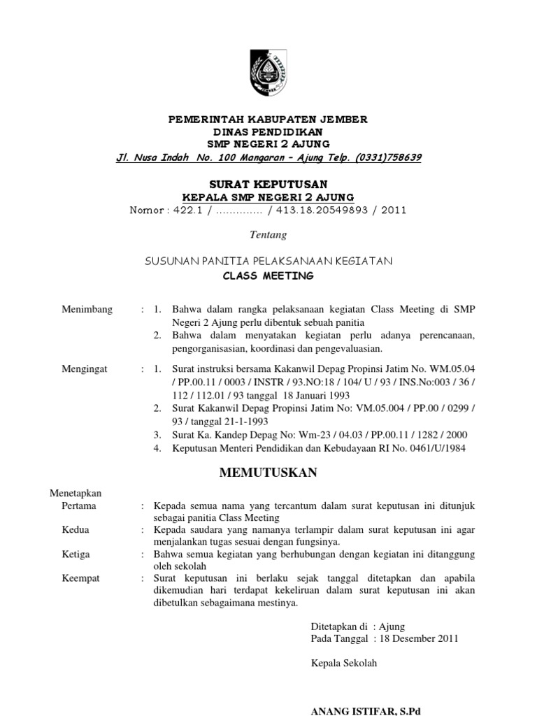 Contoh Surat Keputusan Panitia Pelaksana Kegiatan Kumpulan Surat Penting