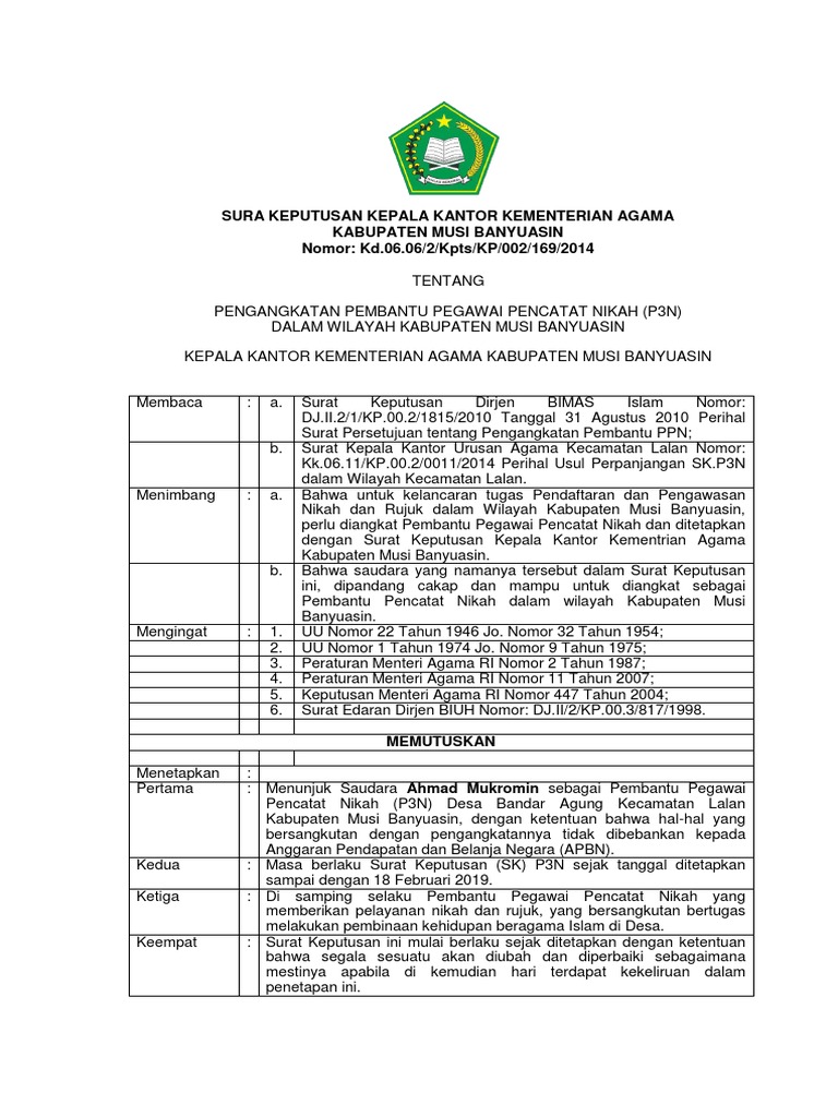 Selamat jumpa lagi bersama sukamulya online kali ini sukamulya online ingin berbagi dengan pengunjung semua tentang contoh Surat Keputusan Kepala Desa untuk PNPM dan Contoh Laporan Keuangan KinerjaMudah-mudahan 2 contoh ini ada manfaatnya bagi pengunjung. Pembantu Pegawai Pencatat Nikah atau Pembantu PPNP3N yaitu anggota masyarakat tertentu yang diangkat oleh Kepala Kantor Kementerian Agama KabupatenKota untuk membantu tugas-tugas PPN di desa. Pembantu Pegawai Pencatat Perkawinan P4 atau dulu dikenal dengan Pembantu Pegawai Pencatat Nikah P3N setelah terbitnya PP Nomor 48 Tahun 2014 keberadaannya menjadi polemik dan tidak jelas.