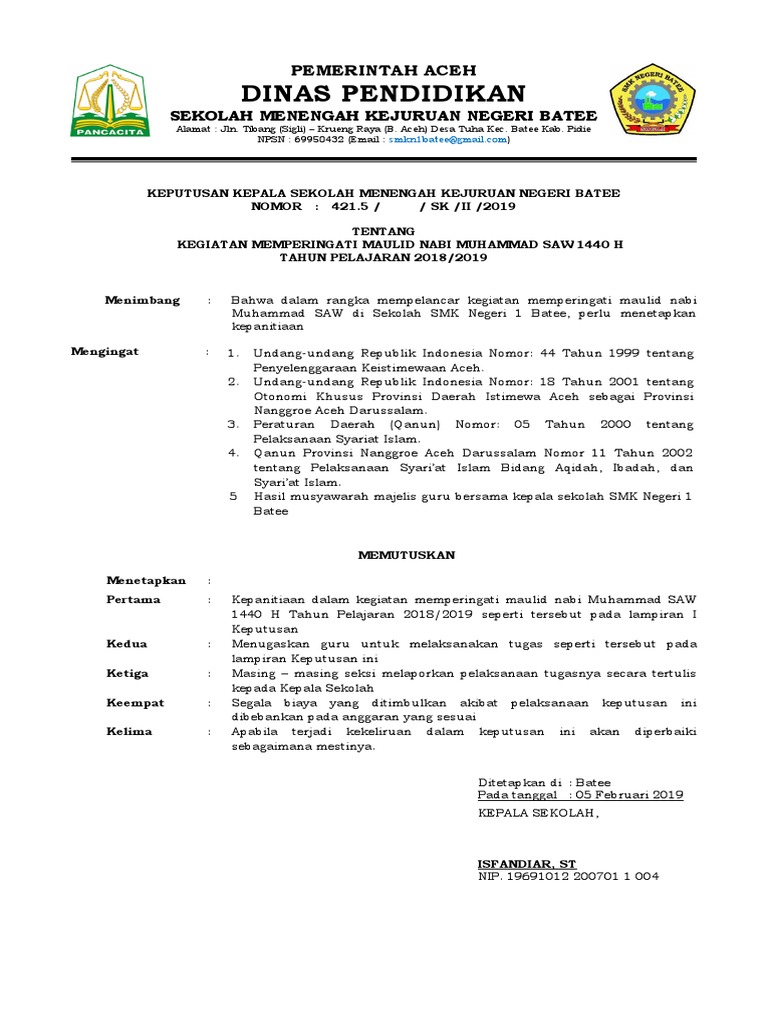 Contoh SK Panitia Acara Peringatan Maulid Hari Lahir Nabi Muhammad 12 Rabiul Awal. Membentuk Panitia Kegiatan Keagamaan Maulid Nabi Muhammad saw SDN Ngembeh 1. CONTOH SK PELAKSANAAN KEGIATAN.
