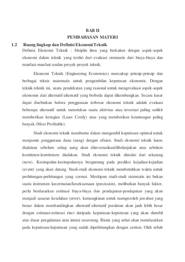 I d Materi9 TIN205 EKONOMI TEKNIK h t t p. Ekonomi Teknik Engineering Economics mencakup prinsip-prinsip dan berbagai teknis matematis untuk pengambilan keputusan ekonomis. Latar belakang pembuatan makalah ini adalah adanya tugas yang diberikan oleh dosen mata kuliah Perekonomian Indonesia.