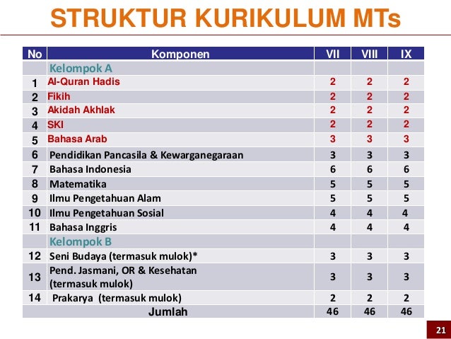 Depag RI 1998 904. Struktur kurikulum pada Madrasah Tsanawiyah sesuai dengan KMA Nomor 184 tahun 2019 sebenarnya tidak terlalu berbeda dengan struktur kurikulum MTs yang berlaku sebelumnyaNamun sesuai regulasi terbaru ini pemerintah memberikan peluang kepada madrasah untuk melakukan inovasi terhadap struktur kurikulum sesuai kebutuhan madrasah. Namun sesuai regulasi terbaru ini pemerintah memberikan peluang kepada madrasah untuk melakukan inovasi terhadap struktur kurikulum sesuai kebutuhan madrasah.